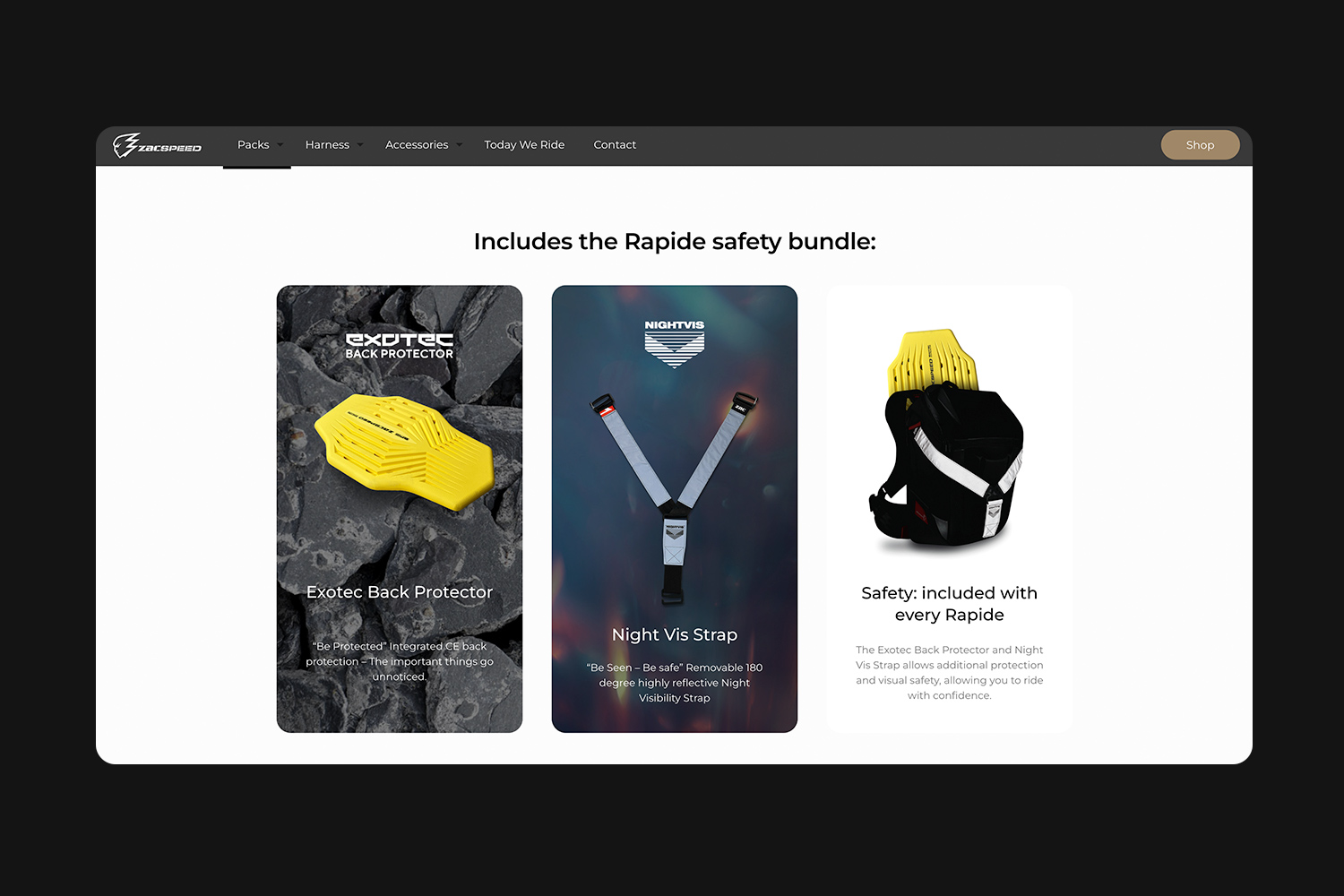 Crucial to the development of the Zacspeed brand was the development of the website on Wordpress. We wanted this to do the bulk of product explaning, setting the mood, have aesthetics that were unmatched in the industry. Because Zacspeed use the Configr8 system, a feature which allows interchangable packs and harnesses, it was important to explain just how these worked. What needs to be said about the Melbourne based brand is that their desire to create quality product for a niche is unmatched. Diving into the motocross, adventure pack lifestyle is what ZacSpeed is all about, and the website reflected that. It's more than a sales pitch, that's for sure, it sets a mood and visual that's appealing for a browse at the very least.